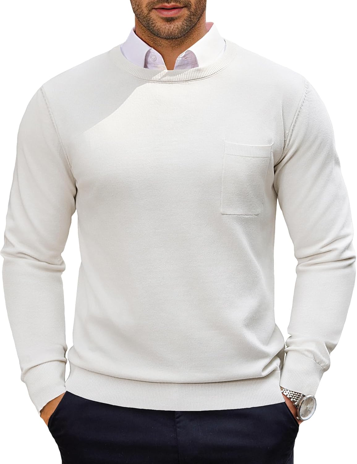 - 【CLASSIC CREWNECK SWEATER】Men’s lightweight knitted sweater designed with crew neckline, long sleeves with chest pocket, elastic ribbed cuffs and hem. The basic solid color pullover sweater is a timeless classic that will keep you feeling stylish and comfortable