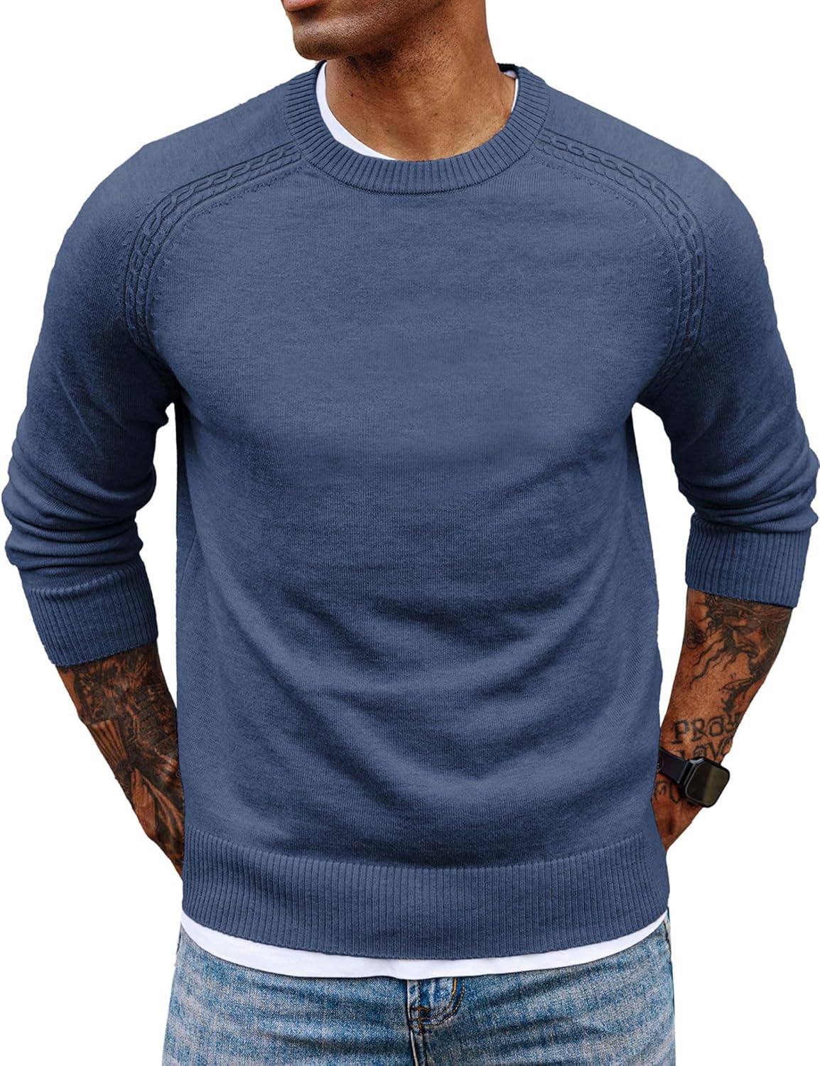 - Stylish Design: men crewneck sweater features classic crew neck, raglan long sleeves, solid color, ribbed neckline, sleeve cuffs and hemline. The slim fit provides a flattering fit.